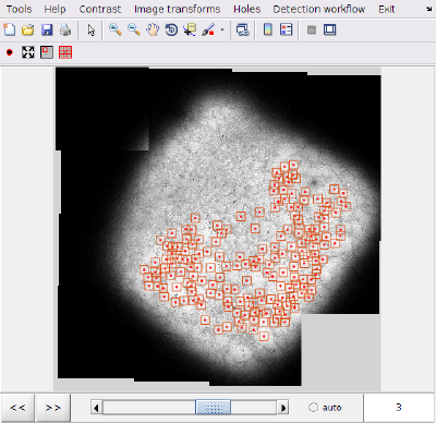 An instance of the Dynamo hole picker can be invoked along with a set of .mrc files, each one containing the image a single polygon. The hole picker allows the application of a predetermined detection workflow on all the polygons, and the manual correction afterwards. It also offers the possibility of tuning the parameters in the hole detection workflow for each of the polygons separately.
