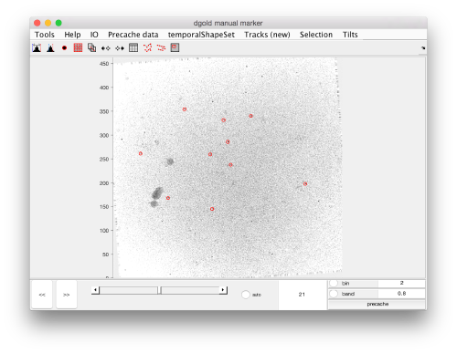 For the sake of simplicity, in this walkthrough, the landmarks of interest will be simply the gold beads, which are trivially recognizable both in tomograms and in projections in the tilt series.